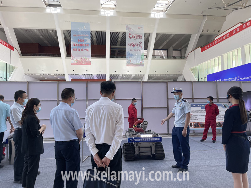 在互動(dòng)環(huán)節(jié),克拉瑪依市消防救援支隊(duì)工作人員向參觀嘉賓展示智能消防機(jī)器人。