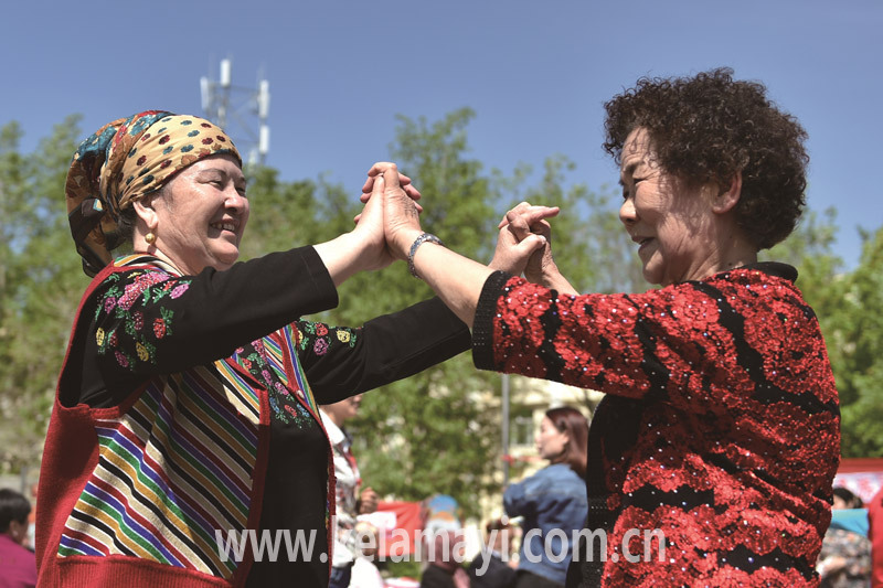 2016年5月,在風(fēng)華社區(qū)舉行的“民族團(tuán)結(jié)一家親”活動上,兩位居民手牽手跳起了舞蹈。(本報資料圖,本報全媒體首席記者 閔勇攝)