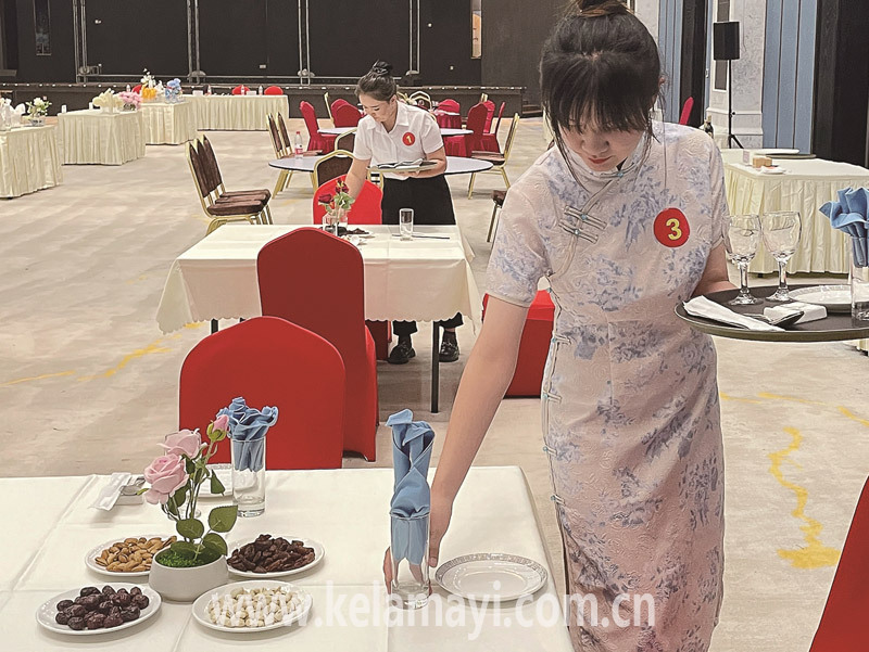 ????在餐廳服務賽區(qū),隨著裁判一聲令下,身穿淡綠色旗袍,來自烏爾禾區(qū)的選手周思彤長舒了一口氣,麻利地清點好物品,開始布置主題宴會餐桌。