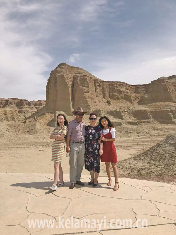 2018年,史婉茹(右一)和迪達(dá)爾·艾曼達(dá)賽一家在世界魔鬼城景區(qū)合照。 圖片由史婉茹提供