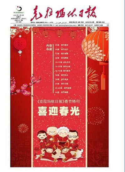 ????在內(nèi)容的選擇和編排上,編輯有意將油城新聞、服務(wù)信息、春節(jié)出行等不同類型的稿件分為若干版塊,在突出新聞策劃的理念引領(lǐng)下,主題更加明確、突出,內(nèi)容更具針對性、可讀性、服務(wù)性,既做到了豐富多彩、琳瑯滿目,又顯得雜而不亂、井井有條;在版式設(shè)計(jì)方面,美編輔以圖片、漫畫、剪紙、對聯(lián)等大量視覺元素,形成了極強(qiáng)的視覺沖擊力。