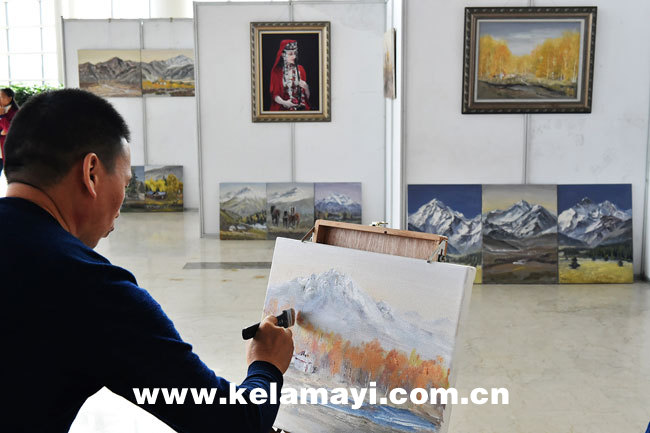 10月25日,2019克拉瑪依投資貿(mào)易洽談會(huì)藝術(shù)作品展現(xiàn)場,藝術(shù)家正在創(chuàng)作作品。 本報(bào)記者 姚繼東攝