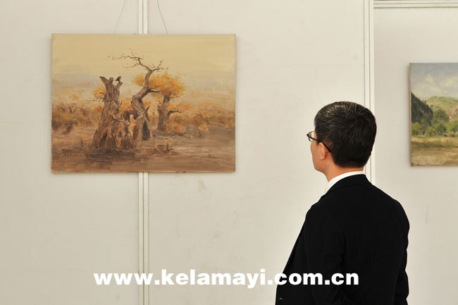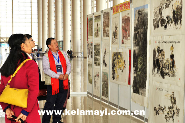 ????10月26日,是2019克拉瑪依投資貿(mào)易洽談會(huì)藝術(shù)作品展展出的第二天。恰逢周末,前來(lái)觀展的市民絡(luò)繹不絕。