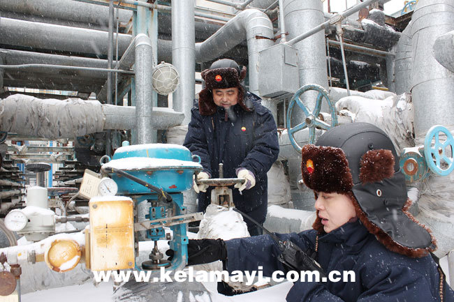 煉油第二聯(lián)合車間員工風雪中嚴細操作。 通訊員 楊玲 攝