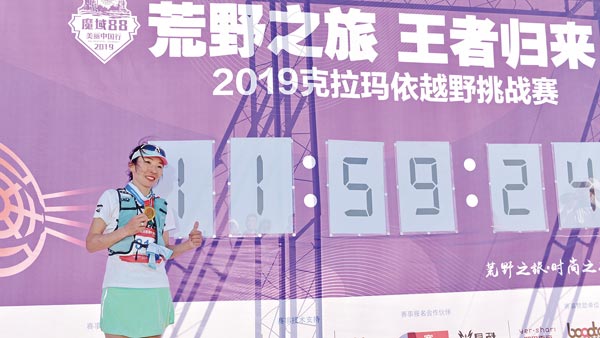 女子100公里冠軍在自己的參賽時間牌前留影。