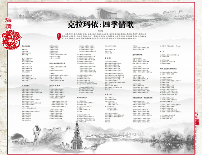????????四季依序而變,風(fēng)物因時不同。我在克拉瑪依的大地上行走,觸景生情,偶然有所感、有所思、有所贊、有所嘆,無意間已成四季之歌。這些長長短短的句子,是這片熱土對我的豐厚饋贈,也是我對這片土地?zé)釔垡缿僦榈拇_鑿證明。在這片神奇的土地上,像我這樣懷著熱愛依戀之情的人不在少數(shù),因此,謹(jǐn)將所感所嘆與諸君共享。