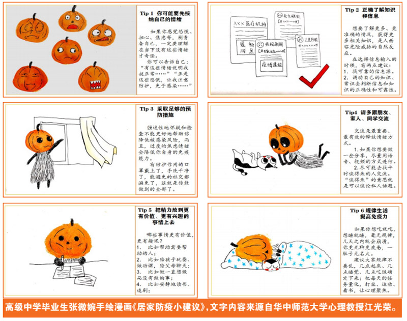 高級(jí)中學(xué)畢業(yè)生張微婉手繪漫畫《居家防疫小建議》,文字內(nèi)容來(lái)源自華中師范大學(xué)心理教授江光榮。