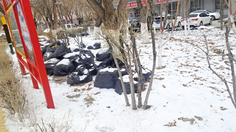 ????在鐘樓附近的坐椅旁,實(shí)地督導(dǎo)推進(jìn)組工作人員看見十幾包收集落葉的黑色垃圾袋。這些垃圾袋上落有積雪,說明至少在較長(zhǎng)一段時(shí)間內(nèi)未及時(shí)清理。對(duì)此,工作人員進(jìn)行了拍照記錄,并通過城市管理平臺(tái)將此問題推送至相關(guān)責(zé)任單位。