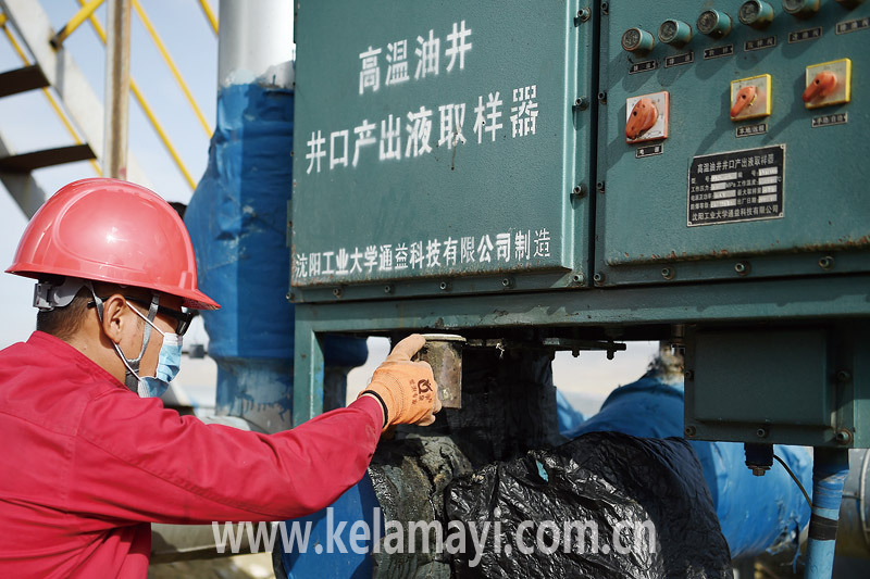 ????本報首席記者 閔勇 攝 2019年9月21日,風(fēng)城油田重1井區(qū),一名采油工正在井口產(chǎn)出液取樣器下取樣。SAGD技術(shù)的不斷進(jìn)步,也促進(jìn)了采油工藝改變。