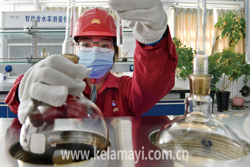 ????本報首席記者 閔勇 攝 2020年9月21日,風(fēng)城油田作業(yè)區(qū)二號抽油聯(lián)合處理站,技術(shù)人員正在對稠油采出液進(jìn)行含水率檢測。