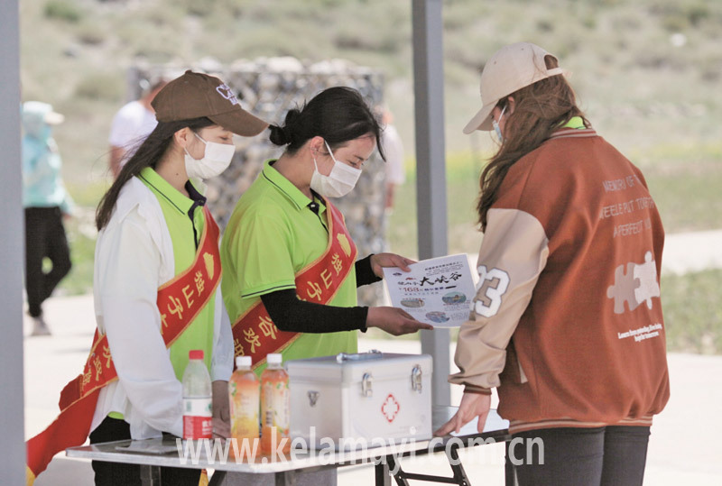 ????在獨(dú)山子大峽谷景區(qū),身披綬帶的文明旅游引導(dǎo)員在景區(qū)入口處以及游客較多的景點(diǎn)服務(wù),不斷引導(dǎo)游客文明旅游,遵守防疫要求。