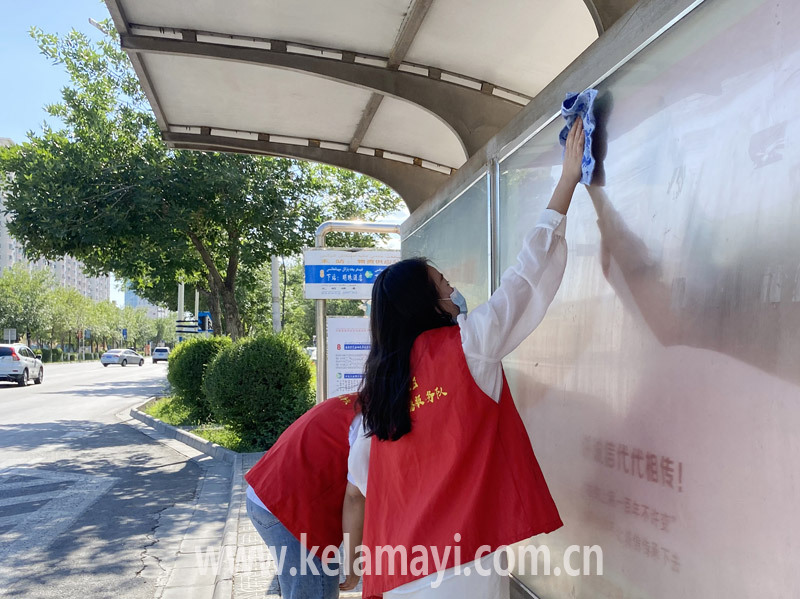 6月7日,文明供應(yīng)社區(qū)志愿者在昆侖路擦拭公交站臺。本報通訊員 李夢夢 攝