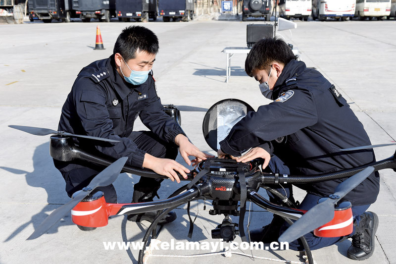 吳濤(左)和隊員在維護保養(yǎng)無人機。本報記者 李浩然 攝