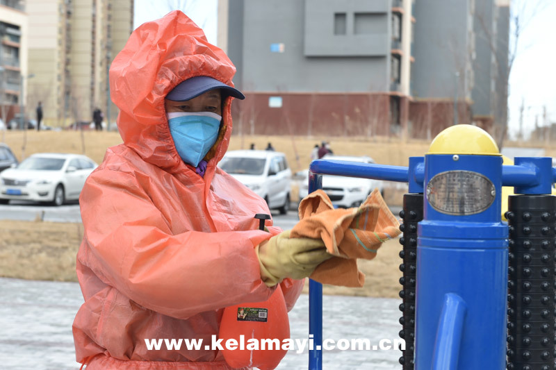 ????工作人員在使用噴霧器對院落、樓道、單元門把手、樓道扶手、等區(qū)域和部位進行全覆蓋霧化消毒。消毒過程中,工作人員嚴格按照操作規(guī)范戴口罩、帽子、乳膠手套,穿工作服。同時,由于居民在小區(qū)活動增多,工作人員使用消毒劑及抹布對小區(qū)健身器材進行了徹底消毒擦拭,確保小區(qū)居民在活動時的健康安全。在清運垃圾時,金色嘉苑社區(qū)專門設(shè)置了口罩、手套等防護裝備的專用垃圾桶,與普通生活垃圾分開處理。
