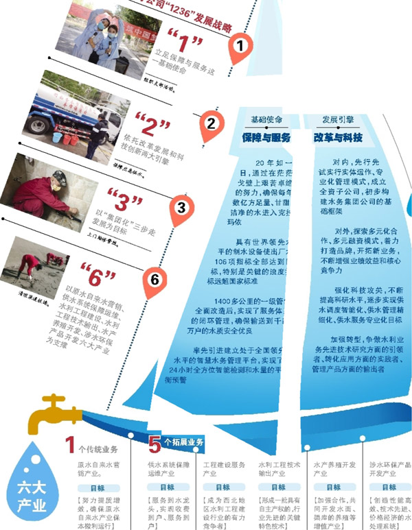 ????2018年10月,市水務公司召開首次黨代會,確立了“1236”發(fā)展戰(zhàn)略,即立足保障與服務這一基礎使命,依托改革發(fā)展和科技創(chuàng)新兩大引擎,以“集團化”三步走發(fā)展為目標,以原水自來水營銷、供水系統(tǒng)保障運維、水利工程建設、水利工程技術(shù)輸出、水產(chǎn)養(yǎng)殖開發(fā)、涉水環(huán)保產(chǎn)品開發(fā)六大產(chǎn)業(yè)為支撐,著眼克拉瑪依市和新疆油田市場,不斷開拓外部市場,逐步將公司建設成為綜合性水務集團,推動企業(yè)發(fā)展動力由“火車頭模式”向“動車組模式”轉(zhuǎn)變,努力走出一條具有克拉瑪依特色的現(xiàn)代國有企業(yè)改革轉(zhuǎn)型發(fā)展之路。