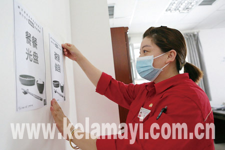 石西油田作業(yè)區(qū)一名員工正在食堂粘貼節(jié)約糧食宣傳標語。本報通訊員 張蕓溪 攝