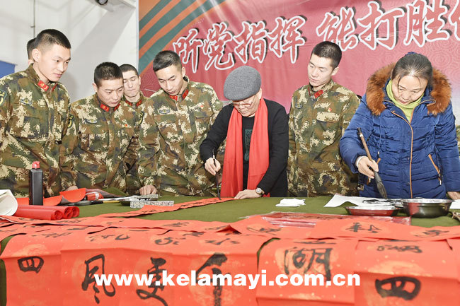 ????1月14日下午,克拉瑪依市武警支隊(duì)報(bào)告廳內(nèi),來(lái)自我市白堿灘區(qū)(克拉瑪依高新區(qū))的書(shū)畫(huà)家正在為武警官兵寫(xiě)春聯(lián)送祝福。當(dāng)天,白堿灘區(qū)(克拉瑪依高新區(qū))民營(yíng)企業(yè)及書(shū)法家共同舉行“文化進(jìn)軍營(yíng)”活動(dòng),沙漠綠洲生態(tài)環(huán)保有限公司等6家企業(yè)以及克拉瑪依書(shū)法家協(xié)會(huì)會(huì)員玄恩生等我市7名知名書(shū)畫(huà)家參加了活動(dòng)。