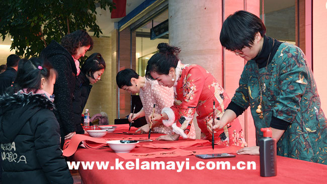 書法愛好者們在方桌上鋪臺蘸墨,寫春聯(lián)、送福字。