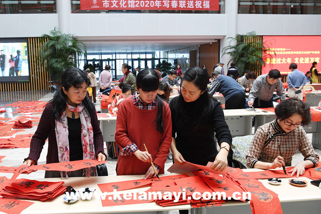 ????據(jù)了解,“寫春聯(lián)、送祝?!被顒又皇切麓夯顒拥摹安暑^”之一。市文化館、書法家協(xié)會、市圖書館通過共同舉辦“寫春聯(lián)、送祝福”活動和2020(庚子)書法、剪紙百“福”作品展及“迎新春、送春聯(lián)”等一系列活動,營造濃厚的節(jié)日氛圍,讓市民感受紅紅火火中國年的文化味道,迎接新春。