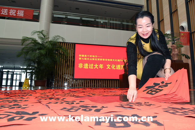 工作人員整理剛剛寫好的福字。