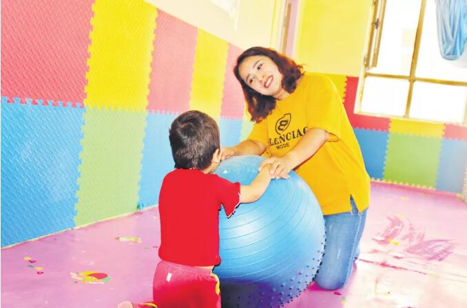 ?第六屆自治區(qū)道德模范阿依努爾 ? 哈力克與腦癱患兒一起做益智游戲。資料圖
