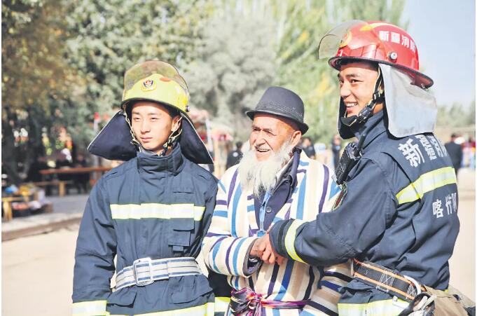 ?澤普縣金湖楊長壽村長壽老人向在村里宣講的消防員致謝。阿布都卡地爾 ? 阿巴斯攝