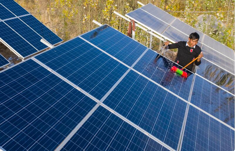 且末縣庫拉木勒克鄉(xiāng)鄉(xiāng)巴什克其克村村民正在清洗光伏發(fā)電板。 楊坤 攝