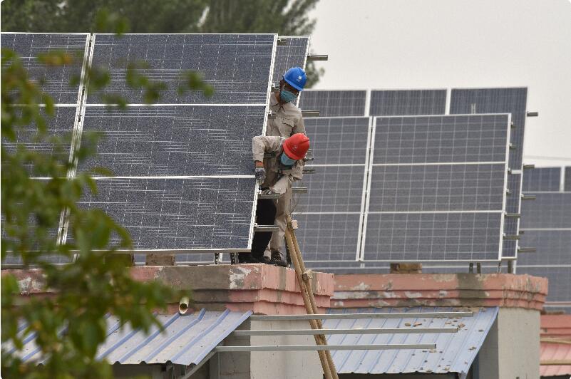 2020年6月20日,供電公司檢修人員檢查村民房頂上的光伏發(fā)電設(shè)施。確·胡熱 攝