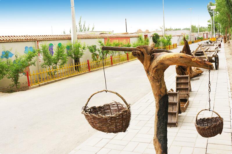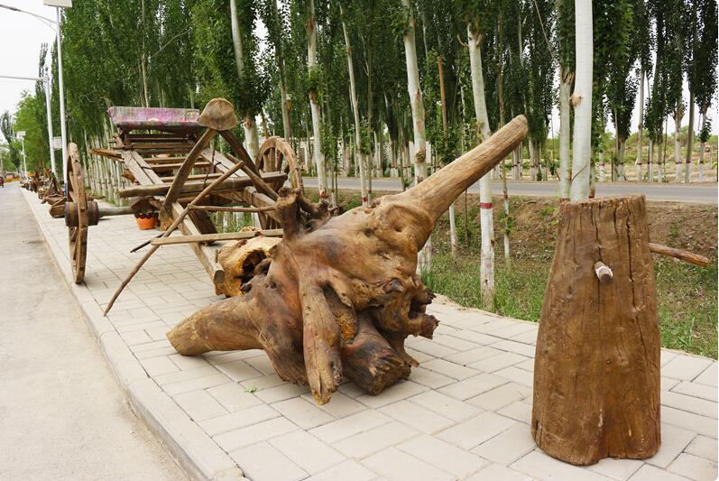 石頭、輪胎、胡楊……村民就地取材,在村口建起了胡楊部落公園;卡盆、紡車、毛驢車……各家各戶拿出自家的老物件100余件,擺在村邊,成了一個留住鄉(xiāng)愁的路邊“博物館”……