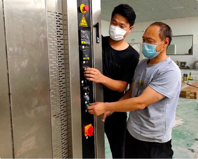6月22日,新疆硒域硒都農(nóng)業(yè)科技有限公司富馕廠廠長王強(qiáng)(左),和該廠技師一起調(diào)試新購進(jìn)的富硒食品加工設(shè)備。