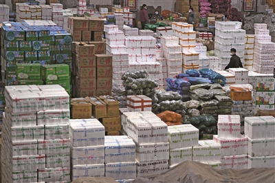 2月1日1時(shí)30分許,市區(qū)北郊的九鼎農(nóng)產(chǎn)品批發(fā)市場(chǎng),新抵達(dá)的蔬菜堆滿各批發(fā)攤位。本報(bào)首席記者 閔勇 攝
