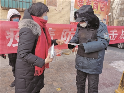 和平社區(qū)居委會(huì)工作人員給疫情防控一線工作人員發(fā)口罩。本報(bào)通訊員 黃華威 攝