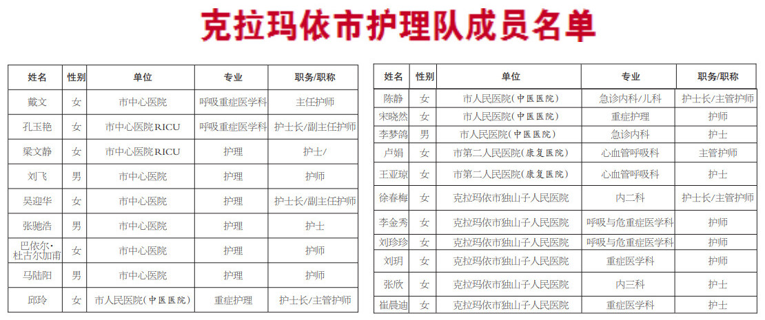 最終確定的醫(yī)療隊(duì)人員中,市中心醫(yī)院有8位,市人民醫(yī)院(市中醫(yī)醫(yī)院)有4位,市第二人民醫(yī)院(市康復(fù)醫(yī)院)有2位,獨(dú)山子人民醫(yī)院有6位。團(tuán)隊(duì)領(lǐng)隊(duì)是市中心醫(yī)院主任護(hù)師戴文。