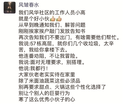 “社區(qū)工作人員一天的辛苦,在家里的您也許無法想象:刺骨的寒風(fēng)中,他們?yōu)榫用癫少徥卟?、藥品,傾倒垃圾,值守門崗力保社區(qū)里的每個(gè)人健康平安??煽吹揭恍┤说男枨螅蚁胨麄兊膬?nèi)心是崩潰的,具體內(nèi)容微信朋友圈已經(jīng)‘刷屏’了,我不再贅述(感覺一些人的需求既豐滿又精致)。通過跟幾個(gè)社區(qū)工作人員交流,我能深深感受到他們心中的那份堅(jiān)毅,他們沒有抱怨,他們還想為大家做更多,但確實(shí)有點(diǎn)兒力不從心。
