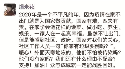 “2、盡量別太辛苦社區(qū)工作人員。上面千條線,下面一根針。防疫工作千頭萬緒,涉及方方面面,現(xiàn)階段,社區(qū)工作本身就很重,現(xiàn)在,社區(qū)所有的居民都‘宅’在家里,一個(gè)社區(qū)上千戶居民,一個(gè)社區(qū)工作者每天得跑很多家。我建議,能不麻煩別人的事情就盡量別麻煩了,特別時(shí)期,都不容易,盡量自己克服。粗茶淡飯不打緊,只要一家人平平安安在一起就是最大的幸福!