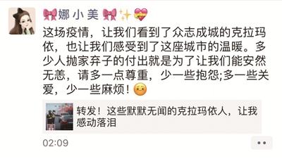 也有越來越多的網(wǎng)友,通過微信朋友圈呼吁大家對社區(qū)工作人員多一份理解。最近,一份《克拉瑪依市一位普通市民的呼吁》就在微信朋友圈“刷屏”了。