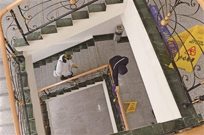 當(dāng)天上午,與于靜彬一樣,31名物業(yè)保安保潔、后勤保障人員,分散在整棟大樓各個(gè)角落,忙于對(duì)辦公樓和進(jìn)出人員消毒,及垃圾收集、分類和清運(yùn)等工作中。