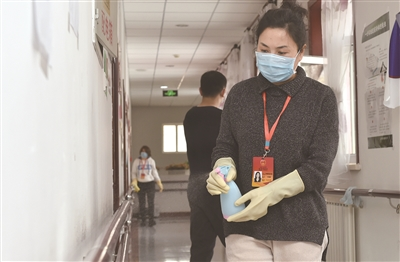 此時(shí),穿著工程服、帶著口罩和護(hù)目鏡的于靜彬,在樓道、電梯口、走廊、衛(wèi)生間等區(qū)域穿梭作業(yè)一個(gè)半小時(shí)了。
