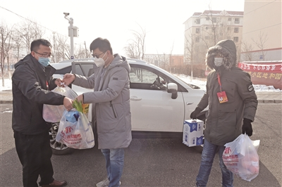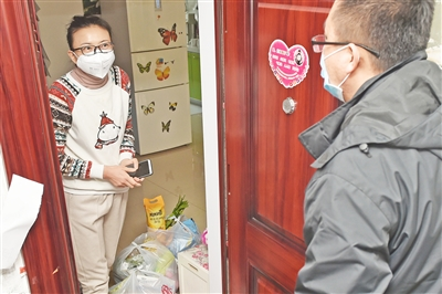 社區(qū)工作人員挨家挨戶為居民送生活必需品。