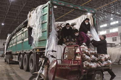 2月5日,九鼎農(nóng)副產(chǎn)品批發(fā)市場蔬菜保鮮庫里,運輸司機(jī)和商戶正在卸土豆。經(jīng)過3天的長途跋涉,由融匯農(nóng)業(yè)公司從內(nèi)蒙古自治區(qū)協(xié)調(diào)調(diào)運的65噸土豆,于2月5日下午抵達(dá)我市九鼎批發(fā)市場。我市防控新型冠狀病毒感染的肺炎疫情期間,融匯農(nóng)業(yè)公司已累計儲備大白菜、青蘿卜、胡蘿卜、土豆等蔬菜670余噸,基本能夠滿足克拉瑪依區(qū)居民半個多月的菜籃子需求。
