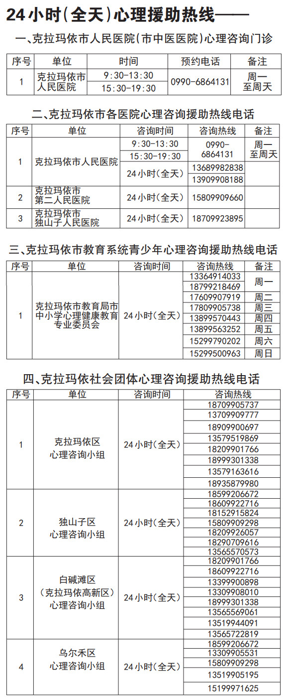 2月3日起,在市衛(wèi)健委的組織下,市人民醫(yī)院(中醫(yī)醫(yī)院)、市第二人民醫(yī)院、市獨山子人民醫(yī)院、市教育局、克拉瑪依區(qū)心理健康教育咨詢協(xié)會、獨山子區(qū)心理衛(wèi)生協(xié)會相繼開通抗疫心理援助熱線,為廣大市民以及社區(qū)服務人員、警察和醫(yī)務工作者等提供情緒疏導、情感支持、危機干預等免費心理援助服務。