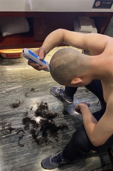 于是,張馳浩自己用電推刀剃了前半邊,請(qǐng)同事幫忙剃了后半邊,成了全隊(duì)第一個(gè)“剃頭明志”的隊(duì)員。