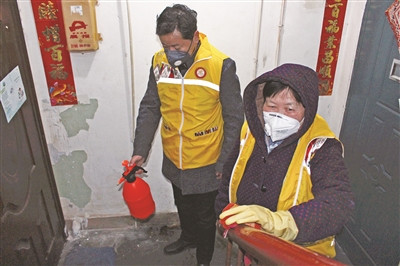 紅旗民主社區(qū)居民徐善勇作為志愿者,在居民樓道進行消毒工作。本報通訊員 王玉晶 攝