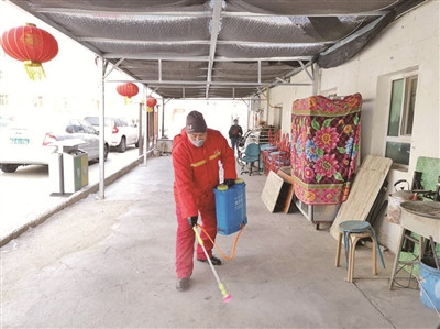 在銀河路街道和諧家園社區(qū),“紅細(xì)胞”黨員正在為小區(qū)公共區(qū)域消毒。 圖片由和諧家園社區(qū)提供