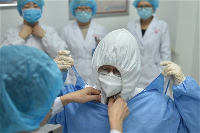 2月11日,上午10時(shí)30分,在定點(diǎn)救治醫(yī)院的培訓(xùn)部,該醫(yī)院第一梯隊(duì)的20名醫(yī)務(wù)工作者正在加緊進(jìn)行穿脫防護(hù)服的培訓(xùn)。海新霞介紹,穿防護(hù)服有十五個(gè)左右的步驟,脫防護(hù)服有二十多個(gè)步驟。每一個(gè)重要?jiǎng)幼饕毩?xí)上百次,穿脫幾次后,往往汗流浹背。