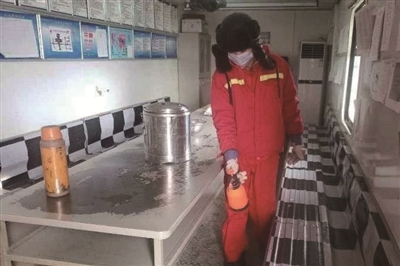 2月10日,瑪18井區(qū),鉆井工人對井場值班房消毒。本報(bào)通訊員 陳軍 攝