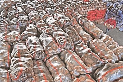 2月13日,九鼎農(nóng)產(chǎn)品批發(fā)市場(chǎng)工作人員正在搬運(yùn)土豆。本報(bào)首席記者 閔勇 攝