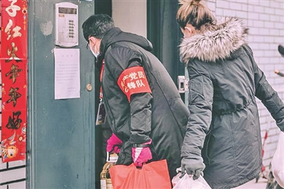 城西古北社區(qū)共產(chǎn)黨員先鋒隊隊員為居民送物品。城西古北社區(qū)提供