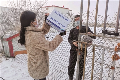 獨山子區(qū)新北區(qū)街道第十六社區(qū)工作人員在為居民送物品。新北區(qū)街道提供