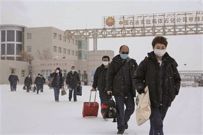 約半小時(shí)后,10輛大客車(chē)分別駛到克拉瑪依市區(qū)員工居住小區(qū)的大門(mén)口,很多員工已經(jīng)背著行囊在風(fēng)雪中等待。